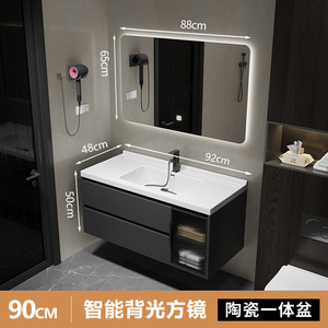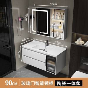 90cm アイアングレーガラスドアスマートミラーキャビネット一体型セラミック洗面器
