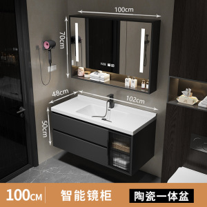 100cm アイアングレーガラスドアスマートミラーキャビネット一体型セラミック洗面器