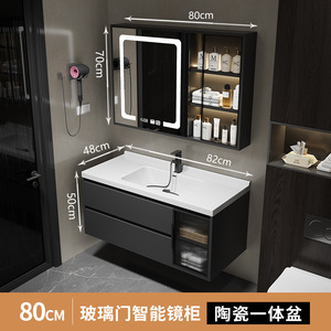 80cm アイアングレーガラスドアスマートミラーキャビネット一体型セラミック洗面器