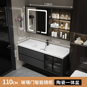 110cm アイアングレーガラスドアスマートミラーキャビネット一体型セラミック洗面器