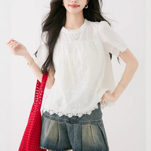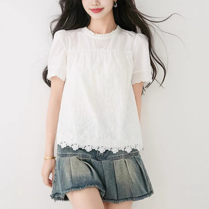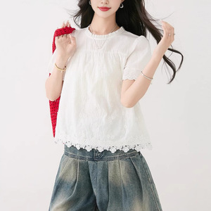 白色蕾丝拼接圆领短袖衬衣衬衫2025夏季新款法式高级感上衣