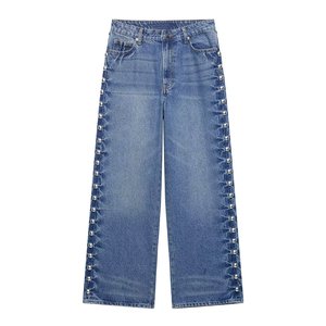 跨境欧美女装速卖通INS爆款侧边重工圆珠铆钉装饰洗水牛仔裤