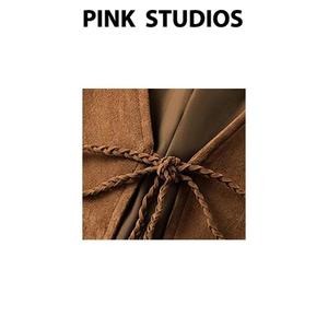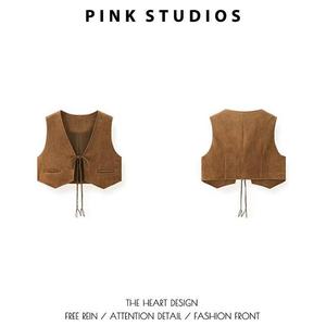 レイヤードスエードカーディガンベストブラウンレトロレースアップVネックベストレディース秋冬メイラードスタイルショートスタイル