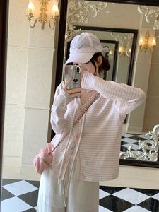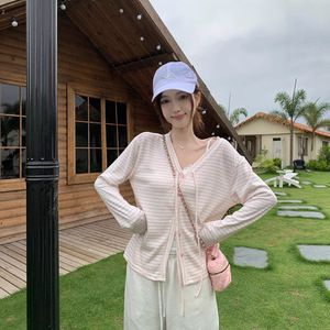 韓国ストライプレース薄いテンセル日焼け止めセーター女性のための 2025 夏の新しいルーズ V ネックトップカーディガン