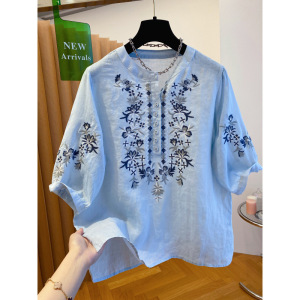 女性のためのハイエンドブルーラミートップ夏 2025 新しいルーズヘビー刺繍ユニークな美しい七分袖シャツ