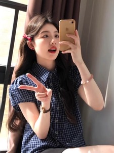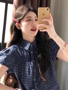 レトロブルーチェック柄パフスリーブシャツ半袖レディース夏日本製スリムショートスリムウエストシャツトップ