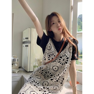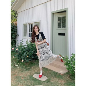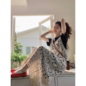 プラスサイズの女性のファットmmレトロ中空レースサスペンダーTシャツスーツドレスベストドレスホリデーロングスカート夏