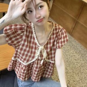 赤いチェック柄半袖シャツレディース春夏フレンチユニークでシックなベビードールシャツデザインニッチショートトップ