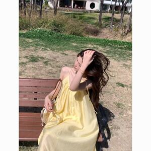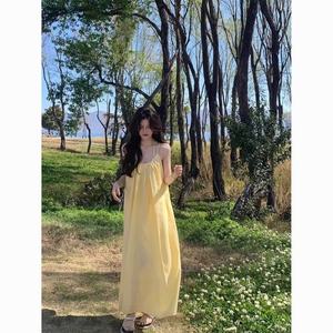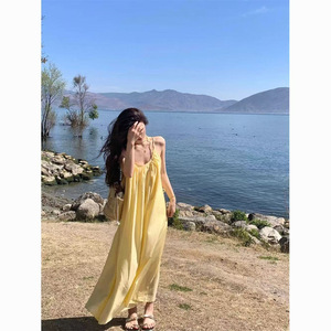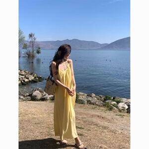 U ネックリゾートスタイルイエローサスペンダードレス女性の夏の新しい三亜海辺バックレスビーチドレスルーズロングスカート