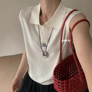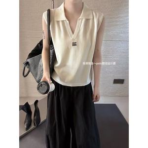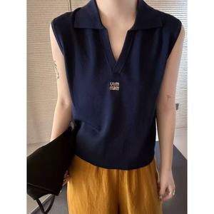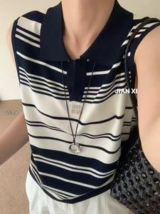 フレンチラペルストライプノースリーブセーターVネックベストベスト夏新作ミュウベストコントラストカラートップ