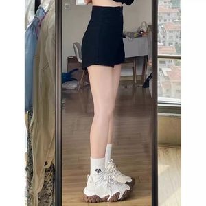 女性用ブラックハイウエストデニムショートパンツ、夏用薄手、大きいサイズ、太ったmm、痩身、お腹カバー、小柄な人向けのAラインワイドレッグホットパンツ