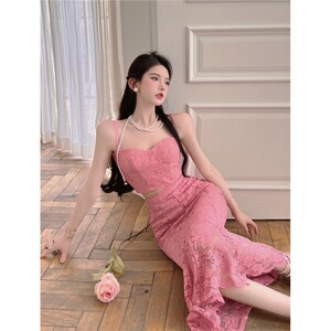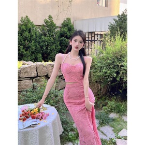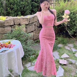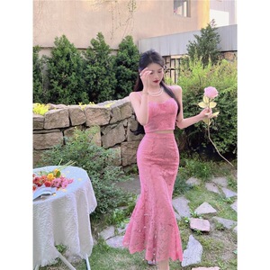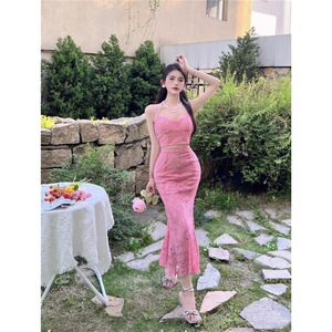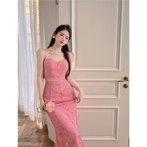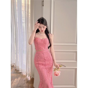 ピーチピンクのレトロなレースのキャミソール、ハイウエスト、ヒップカバー、フィッシュテールスカート、夏の甘いホットガールの純粋な欲望スタイルのスーツ