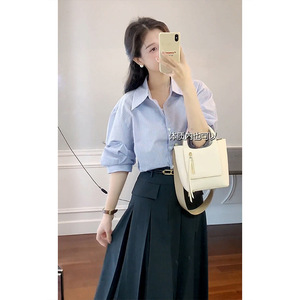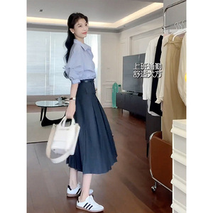 2025早秋新款法式气质名媛高级感小香风蓝色衬衫半身裙两件套装女