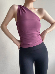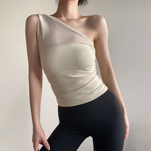 女性用ショルダーツイストヨガキャミソール、胸パッド付き、メッシュプリーツアウターウェア、夏用痩身オフショルダーチューブトップ
