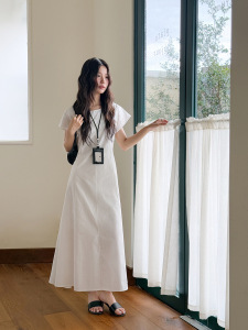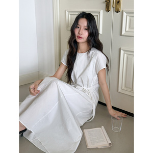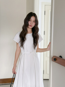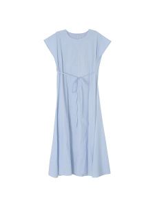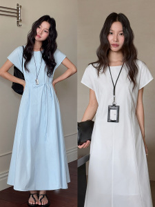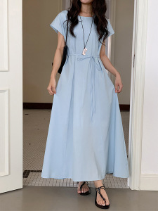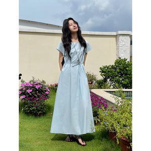 【ミストブルーアイランド2色】Geming フレンチレトロレースアップウエストAラインワンピース 夏ミモレ丈スカート D4943H