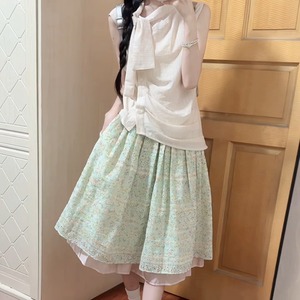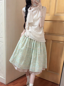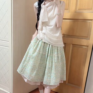 フレンチスイートリゾート風ストライプノースリーブトップとライトグリーン中空スカート2025夏ツーピースセット
