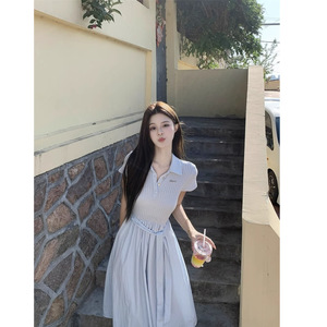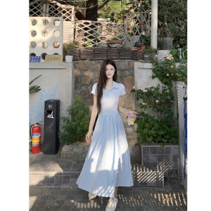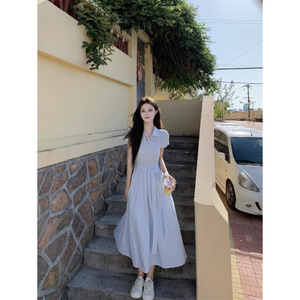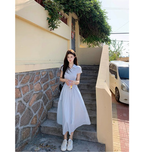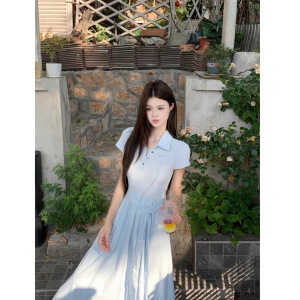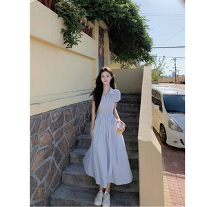 韓国甘いスタイルポロカラードレスレディース夏ウエスト半袖スカートライトブルー痩身Aラインロングスカート