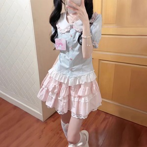 夏季新款韩系可爱少女一整套穿搭粉色蛋糕裙女搭配蓝色娃娃领上衣