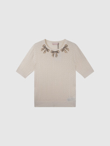[Huajia ラウンドネックリボンテクスチャーニット Tシャツ] 2025 夏の新作テンセルファッションレディース半袖トップ
