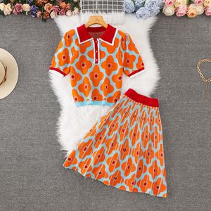 ヨーロッパとアメリカのファッションジャカードニットスカートスーツ、高級ポロカラーショートセーター+プリーツスカート2点セット