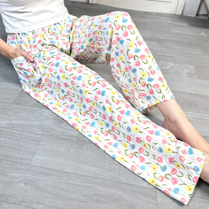 女性用コットンシルクパジャマ、夏用薄手の大きいサイズの人工コットンシルク、屋外で着用可能、家庭用花柄ロングパンツ、ストレートレッグワイド