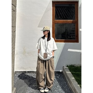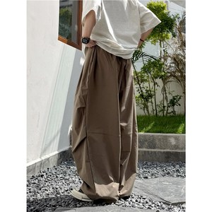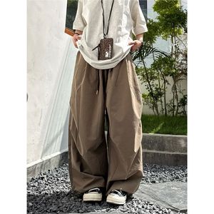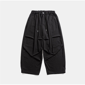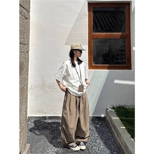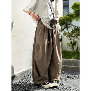 春夏日系复古纯色宽松褶皱水洗阔腿裤男女学生百搭抽绳弯刀裤轻薄