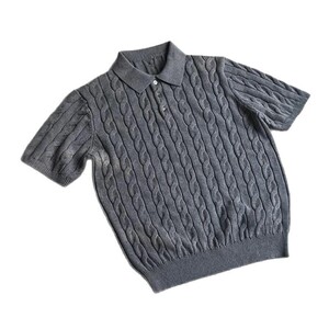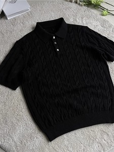 ポロカラー半袖ツイストセーター春夏新作レトロな質感の軽い大人スタイルの黒のピットストリップシンプルトップ