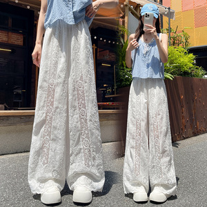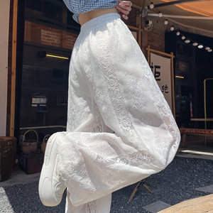 リアルショット刺繍中空ワイドレッグパンツデザインハイウエストスリム伸縮性ウエストフリル裾カジュアルパンツ