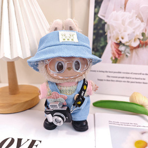 ライトスターブルーのオーバーオール + ピンクのウサギの帽子 + 透明なメガネ + 黒のカメラ + レースアップの白い革靴 (赤ちゃんは含まれません)