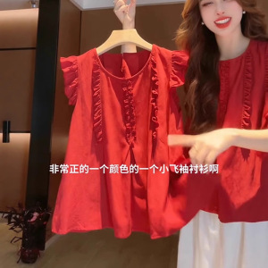 女性用の赤い袖のシャツ、夏の美しいベビードールシャツ、フレンチトップ