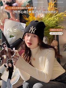 白色加绒打底衫女秋冬季内搭毛衣加厚保暖一体绒木耳边半高领上衣