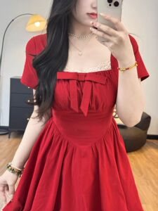 プラスサイズのフレンチレトロスクエアカラーリボンドレス女性の夏のファットmmウエスト痩身プリンセススタイルふわふわスカート