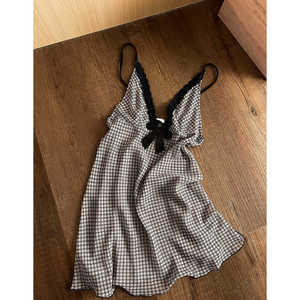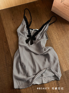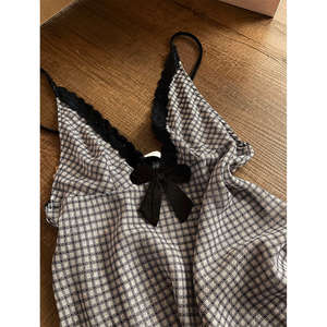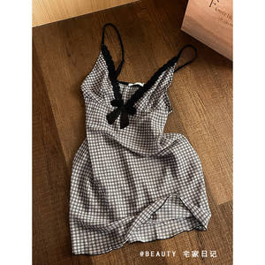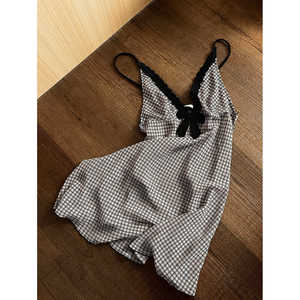 夏の純粋な欲望スタイルの対照的なチェック柄レース V ネックサスペンダーパジャマ女性の春と夏のスカートホームウェアネグリジェ