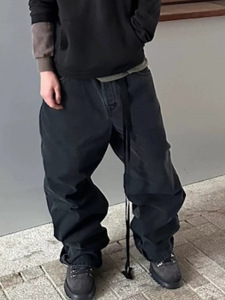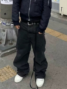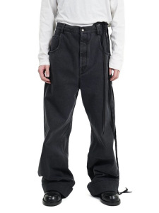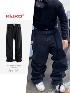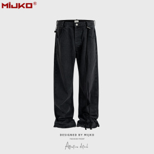 MIJKO メンズ レディース ストレート スタッキング ジーンズ ユニセックス ベルト アクセサリー ウォッシュ加工 ダメージ加工 ブラック パンツ