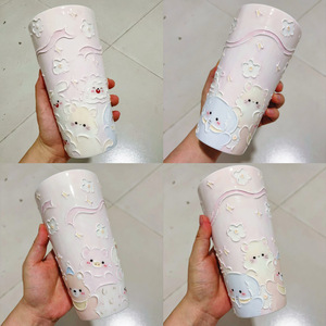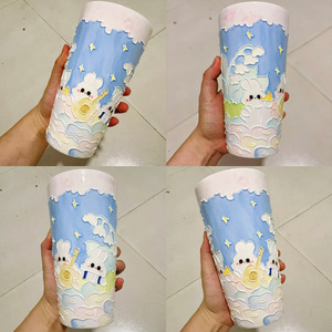 Guochao パイルオブフラワータンブラー 蓋付き ストローカップ 大容量 景徳鎮万華カップ 釉下色手描きウォーターカップ