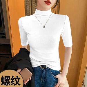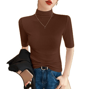 2025新款精致五分袖纯色螺纹恤上衣洋气百搭半高领磨毛打底衫女