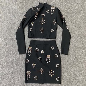 欧美跨境新款时尚镶钻长袖上衣名媛气质包臀裙绷带女装裙套装礼服