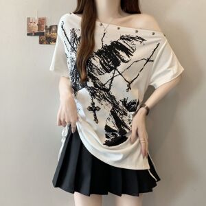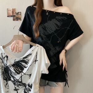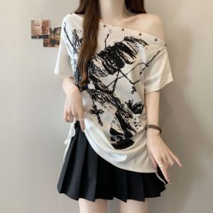 大码复古印花露肩短袖t恤女2025夏季新款韩版宽松显瘦时尚上衣女