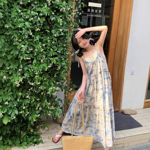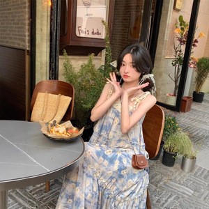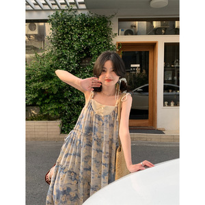 2025新款法式碎花吊带连衣裙女夏季小个子气质收腰长裙欧美