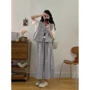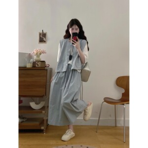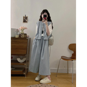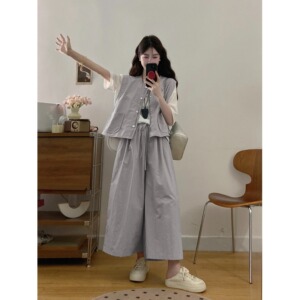 大きいサイズのカジュアルスーツ夏の女性のカレッジスタイルノースリーブレイヤードベストファットMMスリムワイドレッグパンツスカート3点セット
