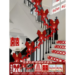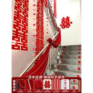 结婚婚礼婚房楼梯扶手布置台阶喜字贴拉花手扶梯新房装饰布幔