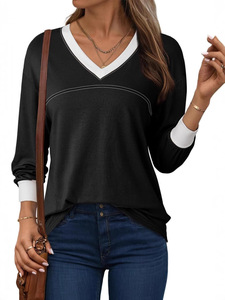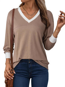 2025 ヨーロッパとアメリカのアマゾン シンプルで多用途なコントラストカラーの大きな V ネック無地ルーズスウェットシャツ薄手のトップカジュアルで多用途