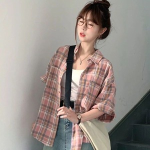 ピンクポロチェック柄半袖シャツジャケット夏デザインニッチ日本レトロカレッジスタイルシャツトップ