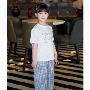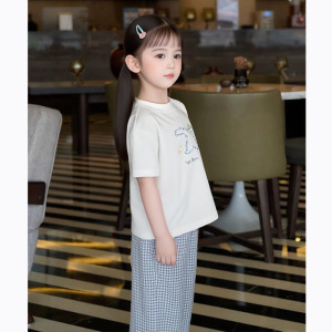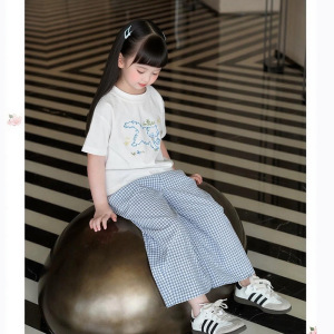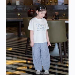 童装夏季新款蓝色清新小众女童纯棉轻薄格子阔腿裤套装2025