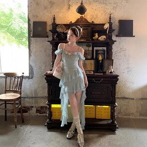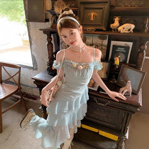 夏日精灵超仙绝美氛围感不规则连衣裙立体花朵甜美波点连衣裙