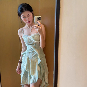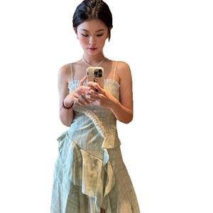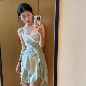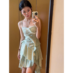 夏季法式复古堆叠连衣裙2025网款格子裙不规则别致气质短裙子