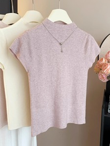 グレーハーフタートルネックニット半袖ボトムシャツ女性のための 2025 春夏新作スリムフィット西洋スタイル Tシャツトップ