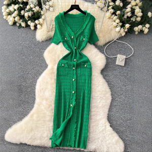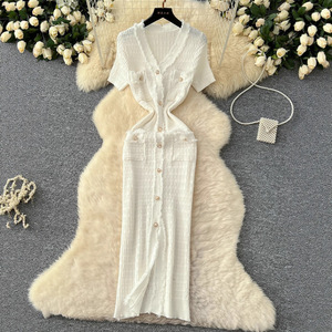 国境を越えた貿易アマゾン半袖ロングスカートレトロVネックシングルブレストスカートヒップ気質ウエスト痩身ドレス