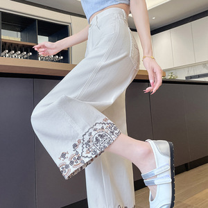 女性用刺繍レース9点ジーンズ2025夏薄手スリムで万能な小柄な人向けのゆったりストレートワイドレッグパンツ