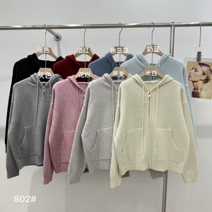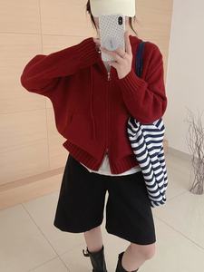 秋冬新款设计感抽绳连帽双拉链口袋休闲针织开衫女简约百搭外套